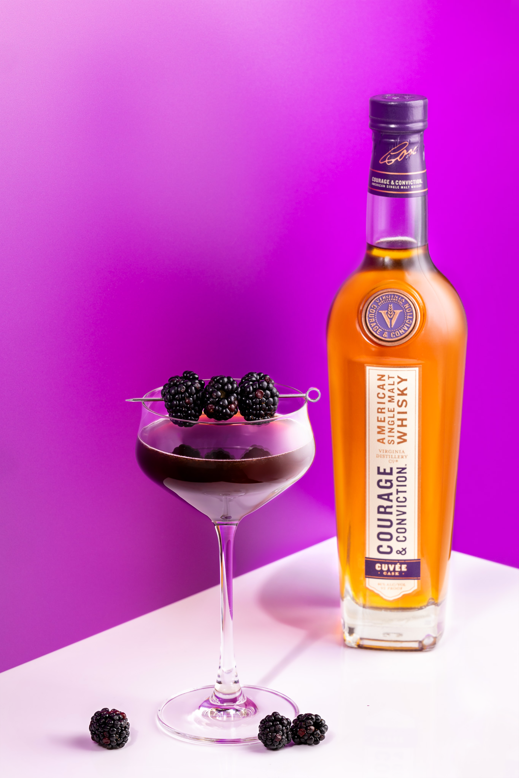 - Blend with Boldness: In a shaker tin, combine the Courage & Conviction Cuvée Cask, cold brew coffee concentrate, blackberry preserves, and Angostura bitters.