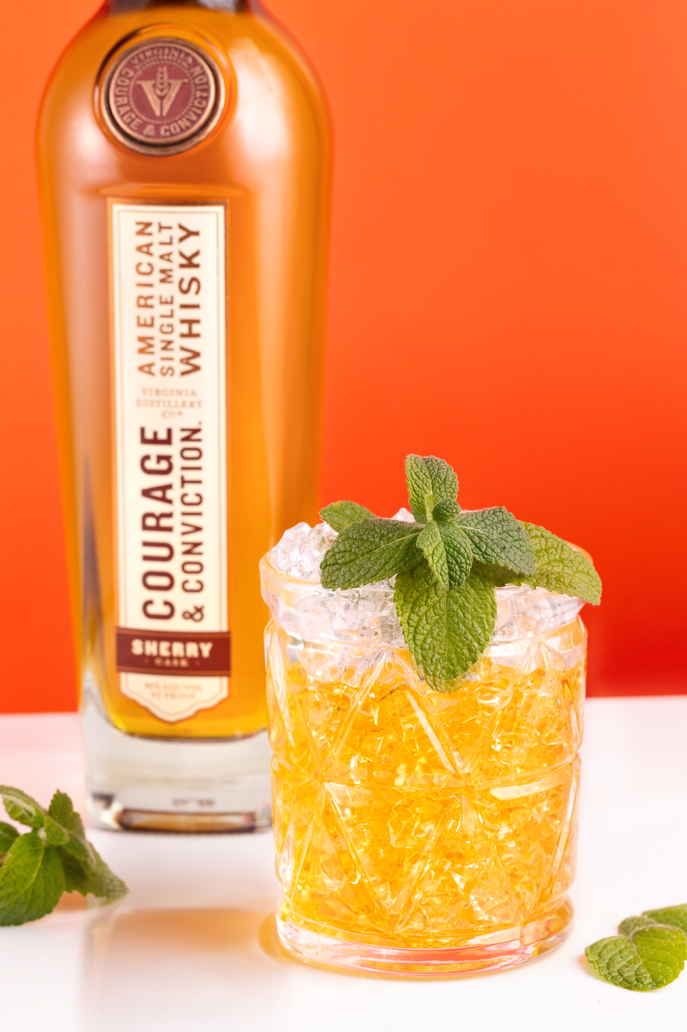 - 1.5 oz Courage & Conviction Sherry Cask: A rich, complex whisky with undertones of candied hazelnut.